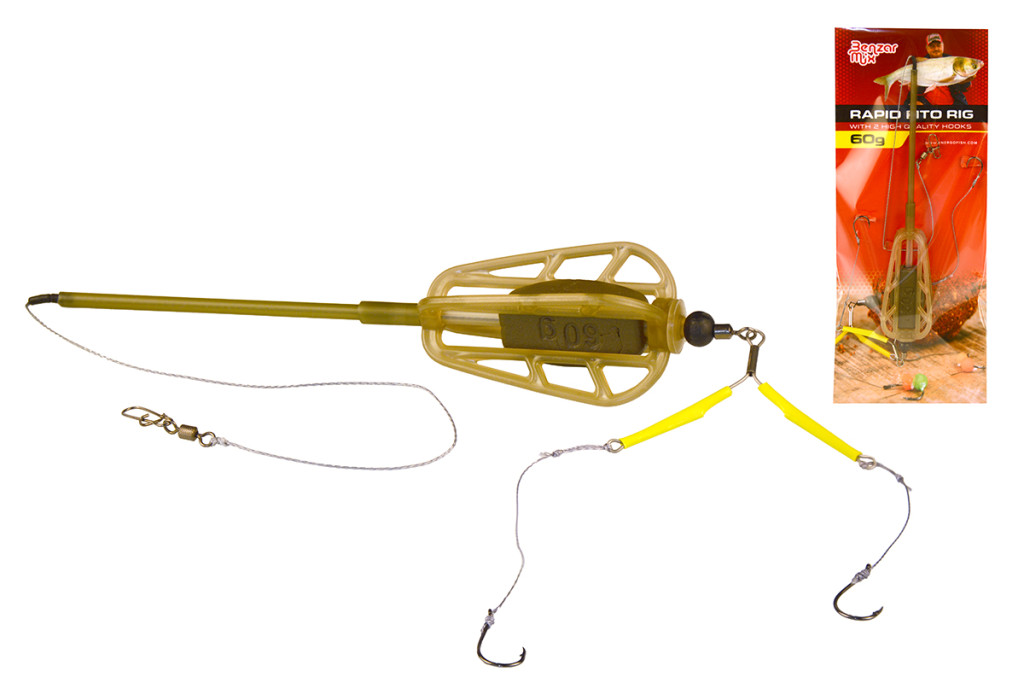 Elkészült ugyanis a Benzár márka kínálatának egyik új, előkötött szereléket megtestesítő eleme, a Rapid Busázó Szerelék. Ez egy olyan, profi, kiváló minőségű alkotórészekből álló összeállítás, mellyel nyugodt szívvel eredhet bárki a busák nyomába. A felső ütközőkkel fixált és alul egy erősített, távtartó, dupla karabiner segítségével rögztett kosár etetőanyagbefogadó kapacitása kellően nagy, és, mivel kifejezetten nagy súllyal is elérhető, akár a folyóvízi horgászathoz is megfelelő alternatívát jelent. A horgok minőségi, tűhegyes és nagyon-nagyon erős kampók, melyekről nem fognak a jó busák sem lemaradni! Mint látható, kéthorgos megoldásról van szó. Az egyik előke 7, a mésik pedig 10 cm hosszú. Természetesen mindkettőt érdemes technopufival ellátva bevetni!