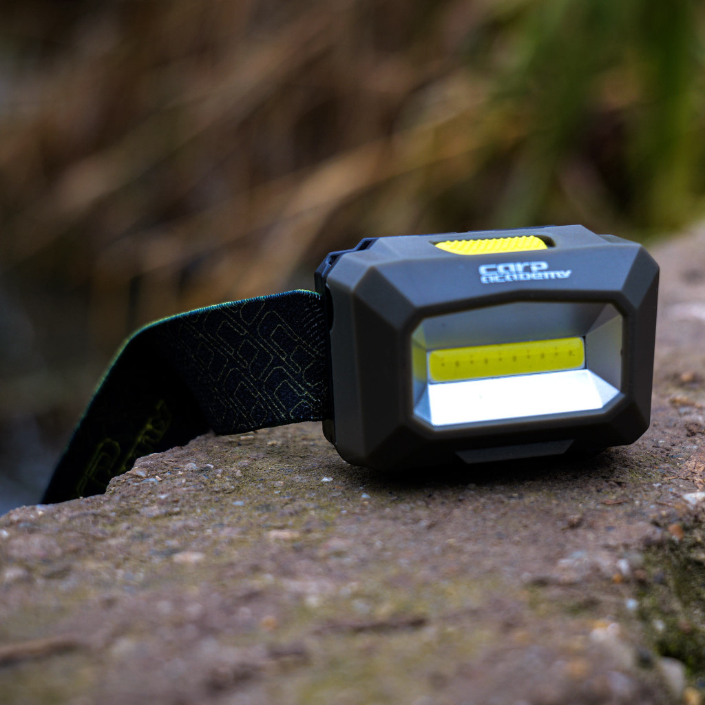 A CARP ACADEMY fejlámpa egy kiváló minőségű LED sorral rendelkező készülék, melynek felső kapcsolójával két féle fényerősség állítható be, valamint a villogó fény. Továbbá a kapcsoló 3 mp lenyomásával bekapcsolható a vörös fény. A beépített akkumulátor a hátsó tartóban kapott helyet, külön bemenettel a microUSB-s töltőnek.