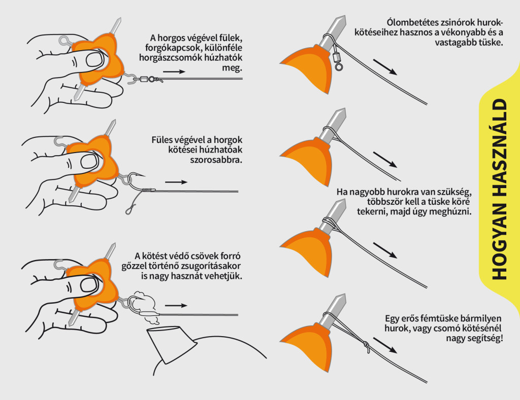 A pontyozó előkék kötésekor rendszeres probléma a kisméretű fülek csomójának megfelelő meghúzása. A multifunkciós csomóhúzóval bármilyen csomókötési probléma megoldható, végfülek vagy horgok kötésénél.
