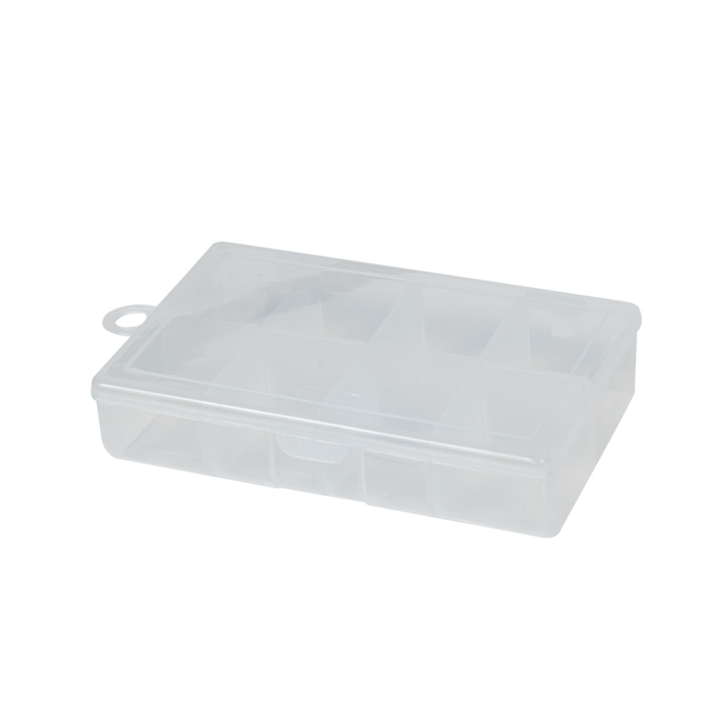 8 fakkos áttetsző műanyag horgos doboz, egyforma méretű fakkokkal, biztonságosan záródó tetővel. Eurolyukkal ellátott.