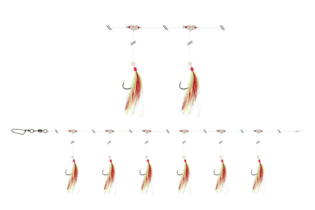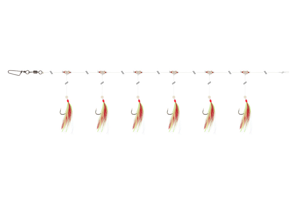 Klasszikus makrélázó szerelék, tollakkal. A rotációs gyöngy hatására gyakori full-house fogás mellett sem gubancolódik össze könnyen, így többször is használható.