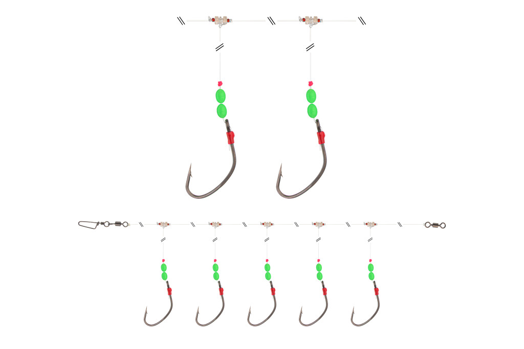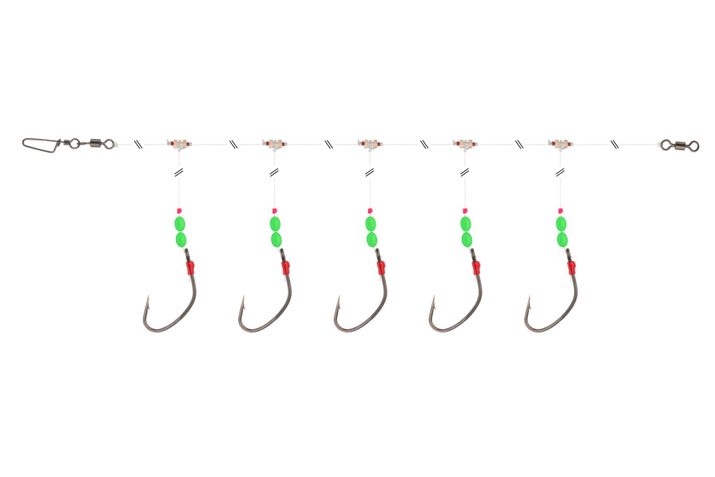 Ez a szerelék ideális vörös sügér horgászatára nagy mélységben. A rotációs gyöngy miatt nagy mélységbe leengedés és onnan felhozás közben nem gubancolódik olyan könnyen a szerelék, így több horgásznapot is végighorgászhatunk vele. A rotációs gyöngy speciális ABS műanyagból készül és ellenáll a legkeményebb terhelésnek is. A széles öblű horgon van elég hely a halszeletnek, és jól fog a hal szájában. A világító gyöngyök növelik a szerelék csalogató erejét.