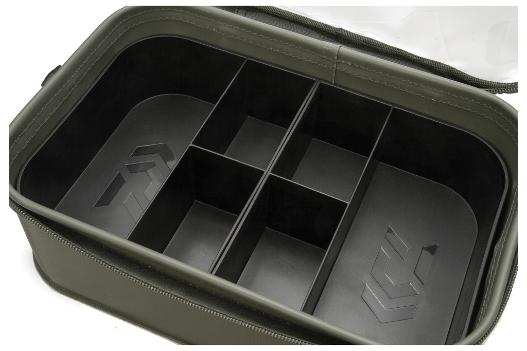 Nagyméretű, vízálló tároló doboz extra vastag, 2mm-es EVA anyagból. Amasszív, merev fedél tálcaként is használható szerelékekkészítésénél. A két, szilárd EVA anyagból készült belső rekesz akeretbe van klipszelve, és a fakkozásnak köszönhetően tárolókéntszolgál aprócikkek, szerelékek, ólmok stb. számára. Az alsó részenelegendő hely van kapásjelzőkjelzők és egyéb eszközök biztonságostárolására.