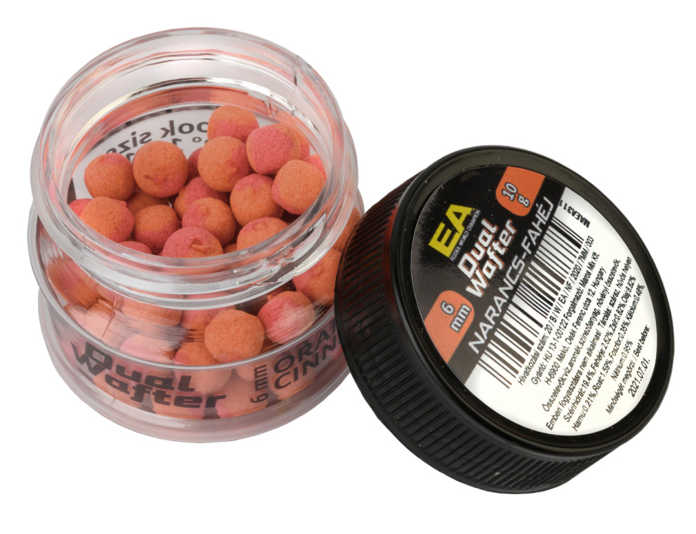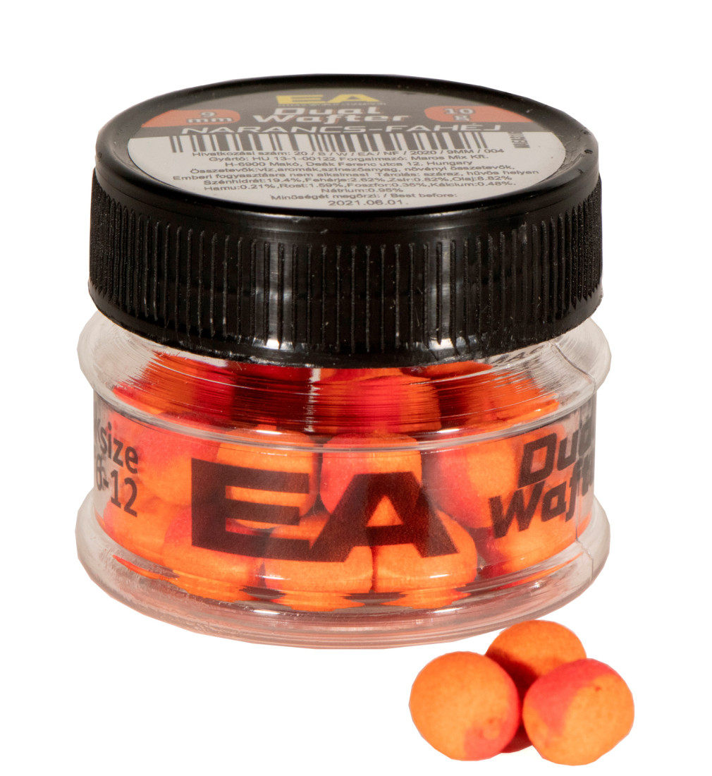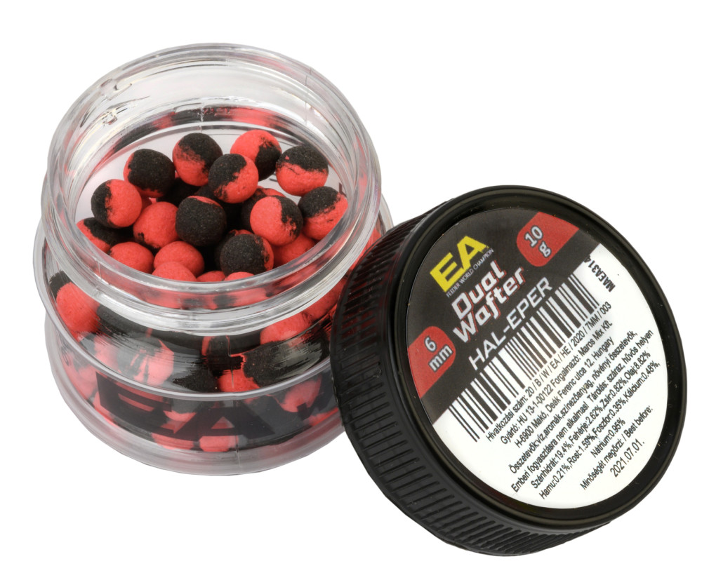 Az elmúlt években method horgászataim során arra a tapasztalatra jutottam, hogy egy eredményes wafter pelletnek a leglényegesebb tulajdonsága az ideális méret és az optimális felhajtó erő.Ezalatt azt értem, hogy a pellet felhajtó erejének tökéletesen kell kibalanszíroznia a pellethez használt horog súlyát és az átmérőjének passzolnia kell az alkalmazott horog méretéhez.Ehhez nyújt tökéeletes egítséget az EA Dual Wafter család Fontossági sorrendben csak ezután, de nem elbagatelizálható módon következik szerintem a pellet színe és aromája.