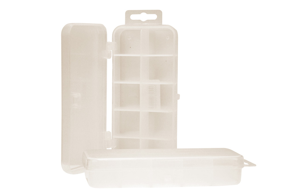 A 10 fakkos doboz 2x5 db, egyforma méretű rekeszre van osztva. Főként apróbb műcsalikat tárolhatunk ebben a dobozban. Mini wobblereket, villantókat, vagy twistereket. Az UL horgászok kifejezetten örülnek ennek a doboz méretnek és kiosztásnak.Kiváló minőségű műanyagból készült, mely nem hajlamos törésre, elöregedésre.Önálló dobozként, vagy egy nagyobb láda szerves részeként is tudjuk használni.Praktikus akasztó füllel rendelkezik.