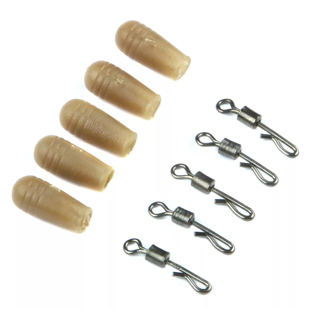 Gyorskapocs a végszerelékekhez, a gumiharang a kötést védi az ólom rögzítésétől.