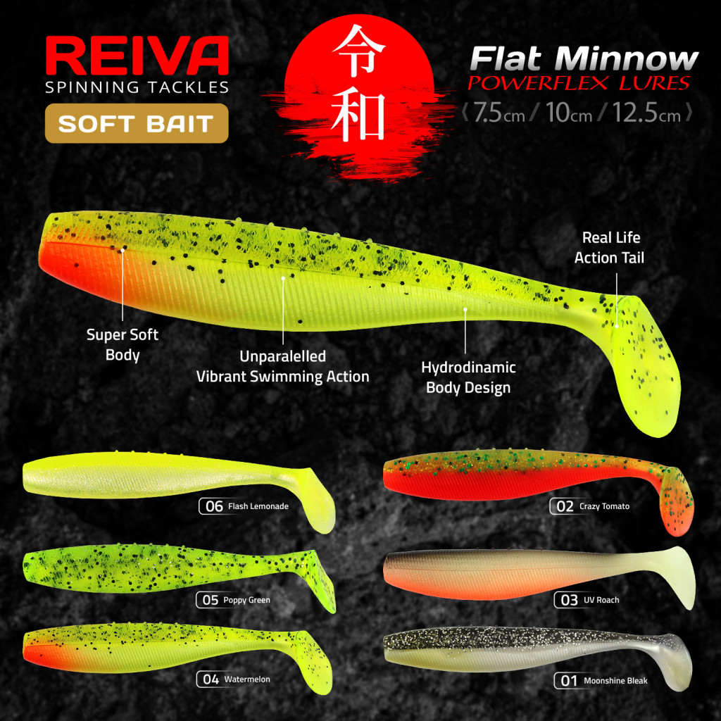A Flat Minnow Shad plasztik csaliknak minden pergető horgász táskájában benne kell lennie. Egyedisége a megnövelt méretű farok-korongban rejlik, amellyel erős rezgéseket kelt a vízben, aminek egy ragadozó sem tud ellenállni.