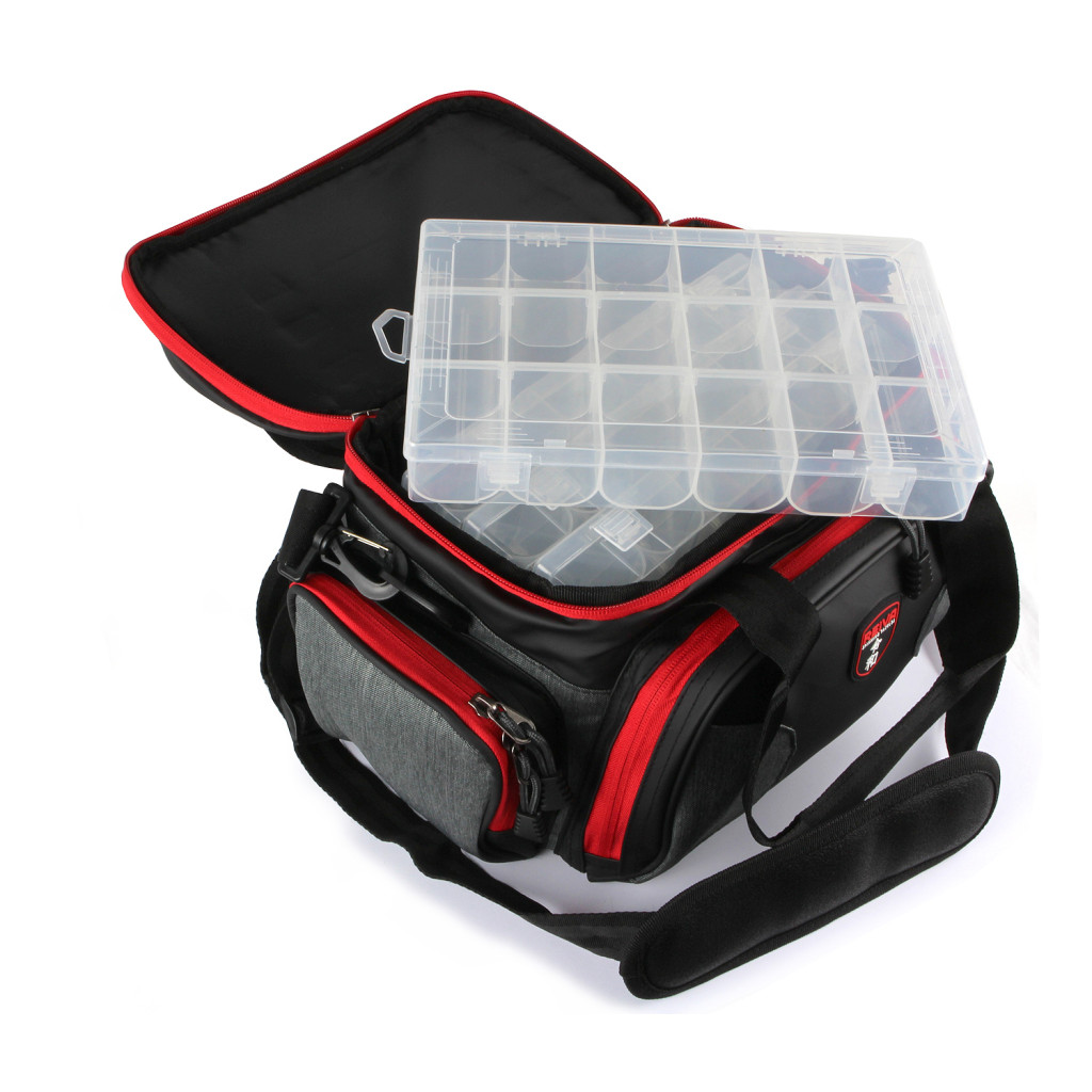 Ez a közepes méretű, kényelmes táska négy külső cipzáros zsebbel rendelkezik és egy nagy tároló résszel, benne négy csalis dobozzal.
