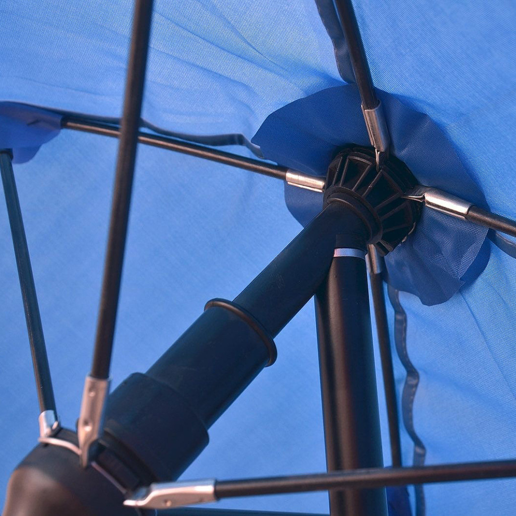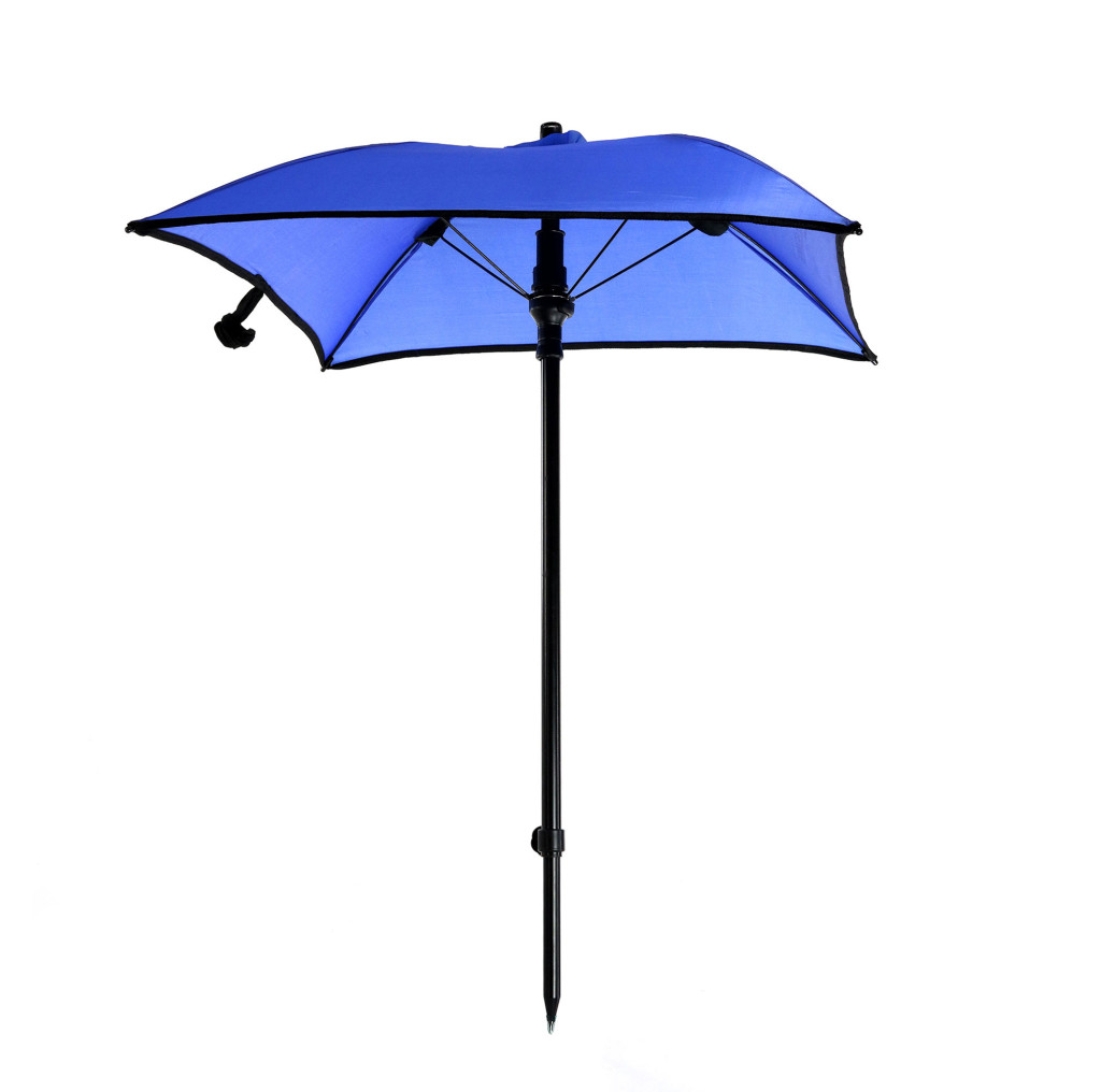 Az ernyőt egy mozdulattal, egy csuklós résszel lehet dönteni, akár 45 fokos szögben. A fejbe belülről egy 45 fokban döntött menetes rész is található, az ernyő szárát oda is be lehet csavarni. Az ernyőhöz összesen 2 szár jár, egyik a befogadó tag, a másik a leszúró, amit a befogadó szárba teleszkóposan be lehet tolni. A szögletes kialakítású ernyő átmérője 70 cm. Vászon hordtáskában szállítjuk.