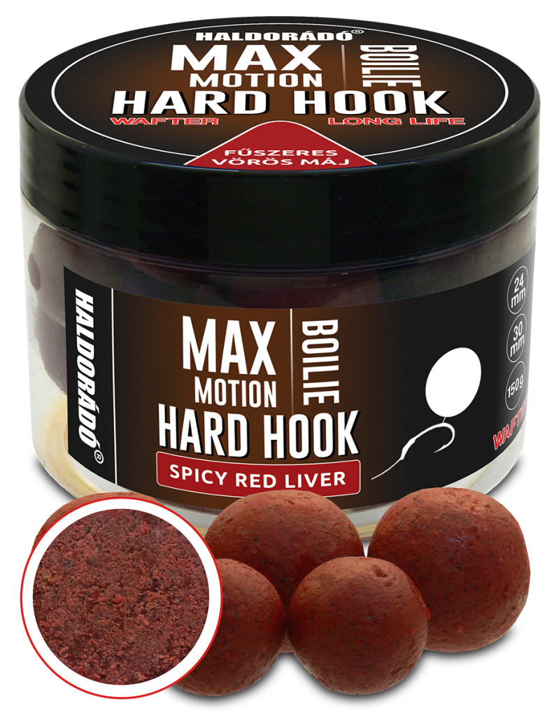 A MAX MOTION Boilie Hard Hook Wafter olyan könnyített, speciális eljárással készült kemény csali, amely egyértelműen azt a célt szolgálja, hogy hosszabb ideig is ellenálljon a zavaró fehérhalak, vagy akár a törpeharcsák támadásának. Keménységét hosszú ideig megőrzi, miközben aromakibocsátása lendületes, így biztosítva figyelemfelkeltő tulajdonságát.Kétféle kiszerelésben található meg a termékcsaládon belül. Az egyik 16 és 20 mm-es, míg a másik 24 és 30 mm-es golyókat tartalmaz. Ennek köszönhetően minden helyzetben lehet a zavaró halak, és a megfogni kívánt halak méretéhez is igazodni.Hétféle változatban érhető el a kínálatban. Ezek a Champion Corn (sárga), Spanyol Mogyoró (világosbarna), Kókusz & Tigrismogyoró (fehér + barna), Édes Ananász (sárga), Nagy Hal (piros), Fűszeres Vörös Máj (bordó) és a Juhar & Banán (fehér).
