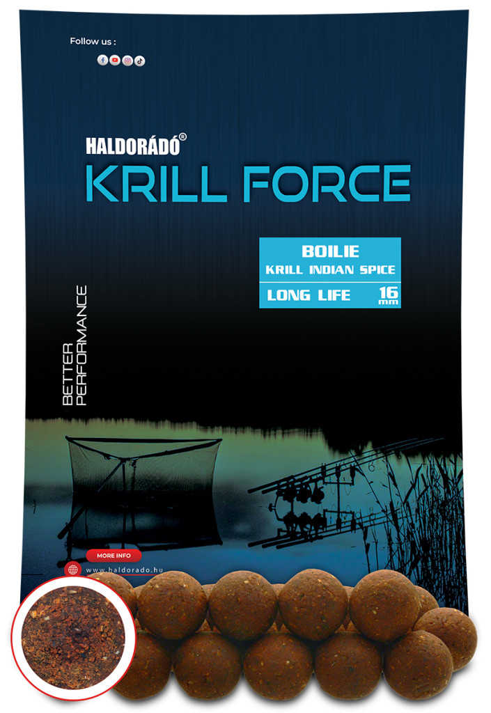 A Krill Force egy teljesen új termékcsalád, melyhez fogható nincs a Haldorádó palettán. Minden e családban lévő termék alapja a legmagasabb minőségű krill és hallisztek mesteri keveréke. Ilyen magas beltartalmi értékekkel rendelkező, ennyire összetett, de ugyanakkor naturális jellegű csali, még nem volt a kínálatunkban.A termékcsalád három tagot számlál, melyek ízesítésben minimálisan eltérnek egymástól. A Krill Natur teljesen natúr, ízesítetlen változat. A Hot Spicy csípős fűszerkeverékkel ízesített, míg az Indian Spice egy különleges indiai, enyhén csípős fűszerkeverékkel készül.Mindhárom Long Life változat, négy különböző méretben érhető el a kínálatban, 16, 20, 24 és 30 mm - es méretekben. Ezek közt minden jól felkészült pontyhorgász megtalálhatja a neki szükséges méretet, az év minden időszakában. Értelemszerűen a kisebb változatok a hidegebb vizekben, míg a nagyobb méretek felmelegedett vízhőfok esetén eredményesebbek, de a méretekkel akár szelektív horgászat is művelhető.